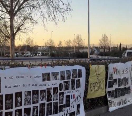 當(dāng)?shù)貢r(shí)間2月20日,皇馬球迷在皇馬體育城外懸掛橫幅,聲援維尼修斯與姆巴佩,力挺二人反對(duì)種族歧視的行為。橫幅上...