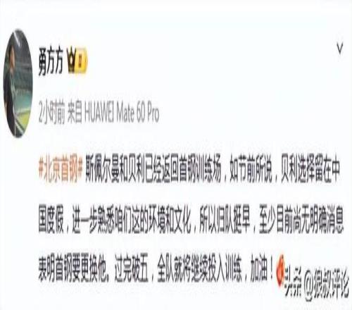 北京時間2月21日,根據北京記者勇方方的報道,“斯佩爾曼和貝利已經返回首鋼訓練場,如節(jié)前所說,貝利選擇留在中國度假,進一步熟悉咱們這的環(huán)境和文化,所以歸隊挺早,至少目前尚無明確消息表明首鋼要更換他。過完破五,全隊就將繼續(xù)投入訓練,加油! ”