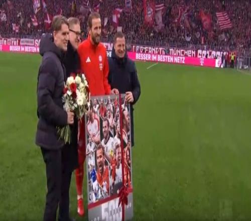 在客場(chǎng)對(duì)陣不萊梅一戰(zhàn),凱恩梅開二度,迎來了職業(yè)生涯500球里程碑。同時(shí),凱恩22場(chǎng)德甲打入26球,打破了萊萬保持的德甲同期進(jìn)球紀(jì)錄,凱恩也成為史上第一位前三個(gè)德甲賽季至少打入25球的球員。在對(duì)陣法蘭克福之前,拜仁為凱恩送上了紀(jì)念品。