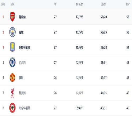 在積分榜上,阿森納依然占據(jù)榜首位置,戰(zhàn)績是17勝7平5負(fù),拿到58分。曼城贏球之后繼續(xù)縮小與阿森納的差距。曼城總積分達(dá)到56分,僅僅落后阿森納2分。曼城最快下一輪能夠登頂,當(dāng)然,大前提是阿森納丟分。沒想到阿森納之前累積的優(yōu)勢變得這么小。阿斯頓維拉51分排名第3。戰(zhàn)平的切爾西總積分是45分,排名第4。少賽一場的曼聯(lián)也是45分,排名第5。利物浦以42分排名第6。