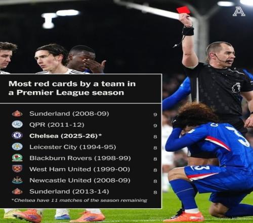 已拿8紅,切爾西剩余11輪英超若再拿一紅即可追平賽會(huì)紀(jì)錄