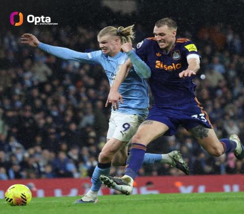 哈蘭德對陣紐卡贏下12次對抗,為個(gè)人在五大聯(lián)賽單場最高數(shù)據(jù)