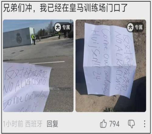 皇馬俱樂部某站賬號評論區(qū),就有IP定位西班牙的網(wǎng)友留言,他曬出了自制反歧視標(biāo)語,強調(diào)會前往皇馬訓(xùn)練場表達(dá)態(tài)度,從網(wǎng)友曬出的照片看,他真的去了現(xiàn)場,為網(wǎng)友執(zhí)行力點贊!