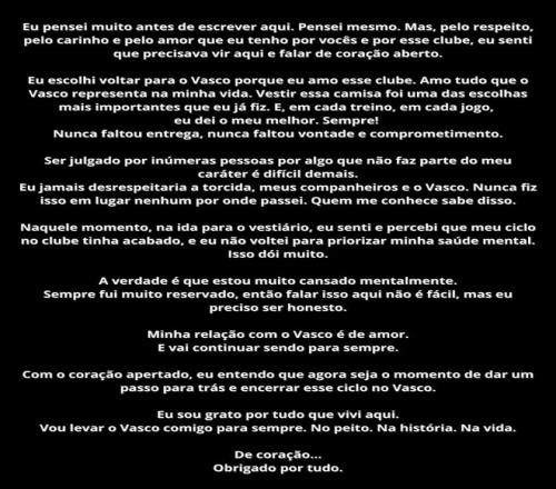 “在深思熟慮之后,我決定坦誠(chéng)地表達(dá)我的感受。”庫(kù)蒂尼奧寫(xiě)道,“我選擇回到瓦斯科達(dá)伽馬是因?yàn)槲覍?duì)俱樂(lè)部的熱愛(ài)。我熱愛(ài)這里的一切,甚至超過(guò)了我過(guò)去的一切。在每一次訓(xùn)練和每一場(chǎng)比賽中,我都全力以赴。我從未缺乏奉獻(xiàn)精神、意愿和責(zé)任感?!?/p>